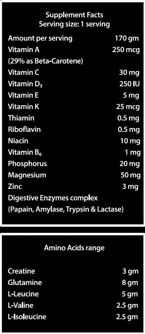 - Amino Acid Mix: 3 grams of creatine, 10 grams of BCAAs, and 8 grams of glutamine (from both added and naturally occurring sources).